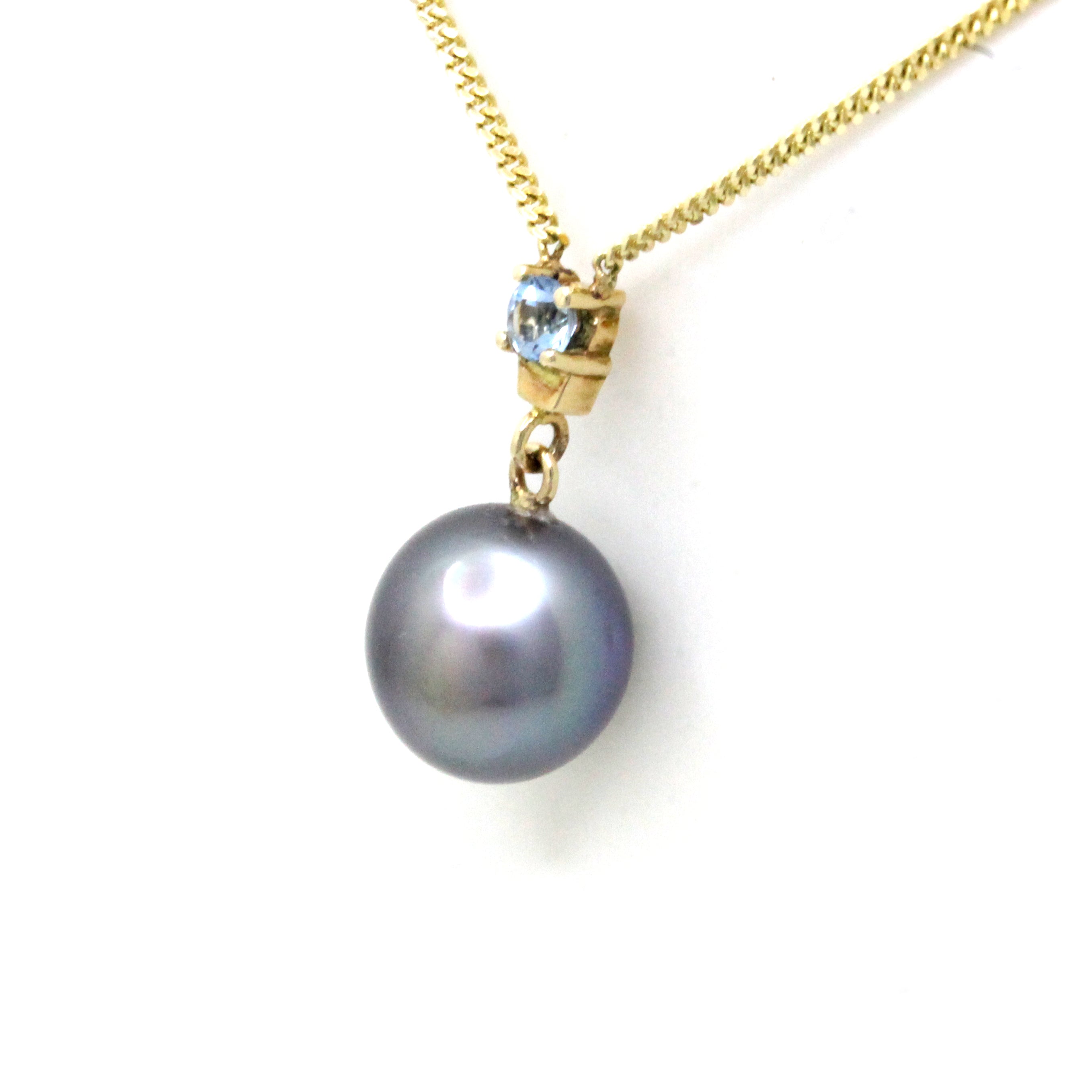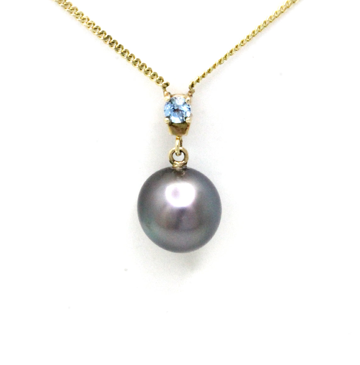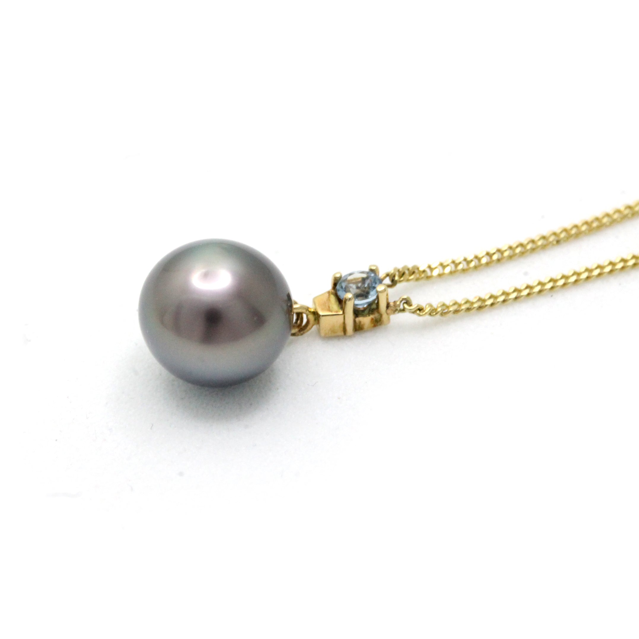 Impressive Dark Pearl on 14K Yellow Gold Pendant with Aquamarine