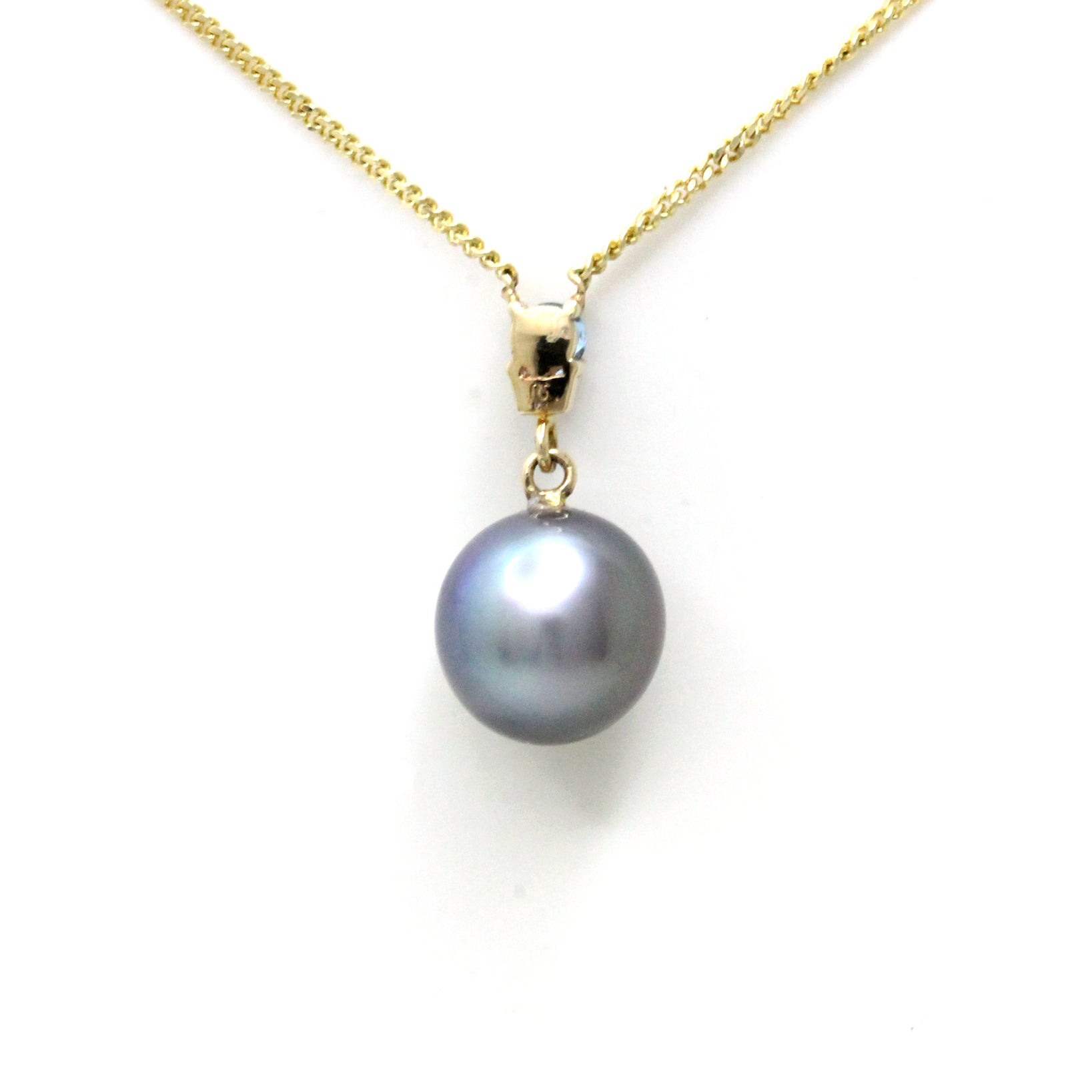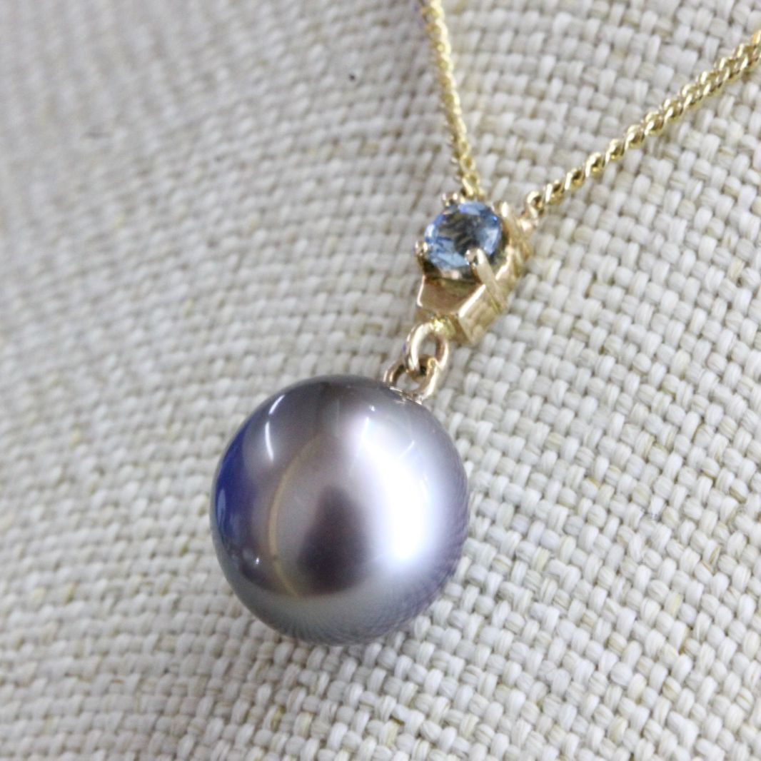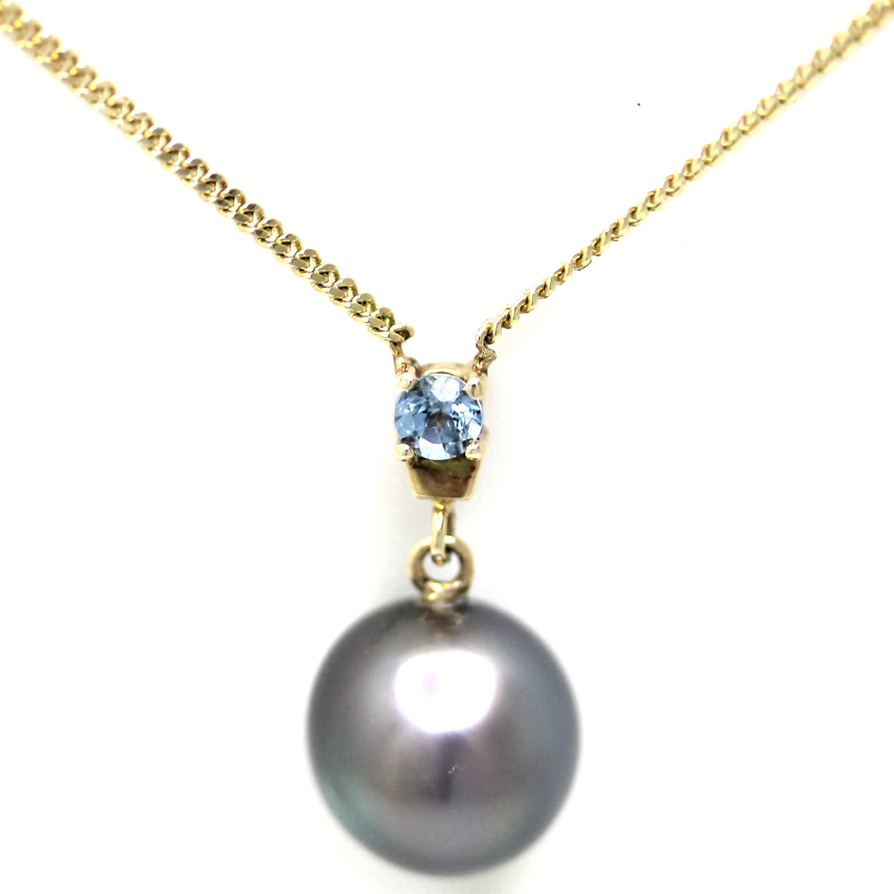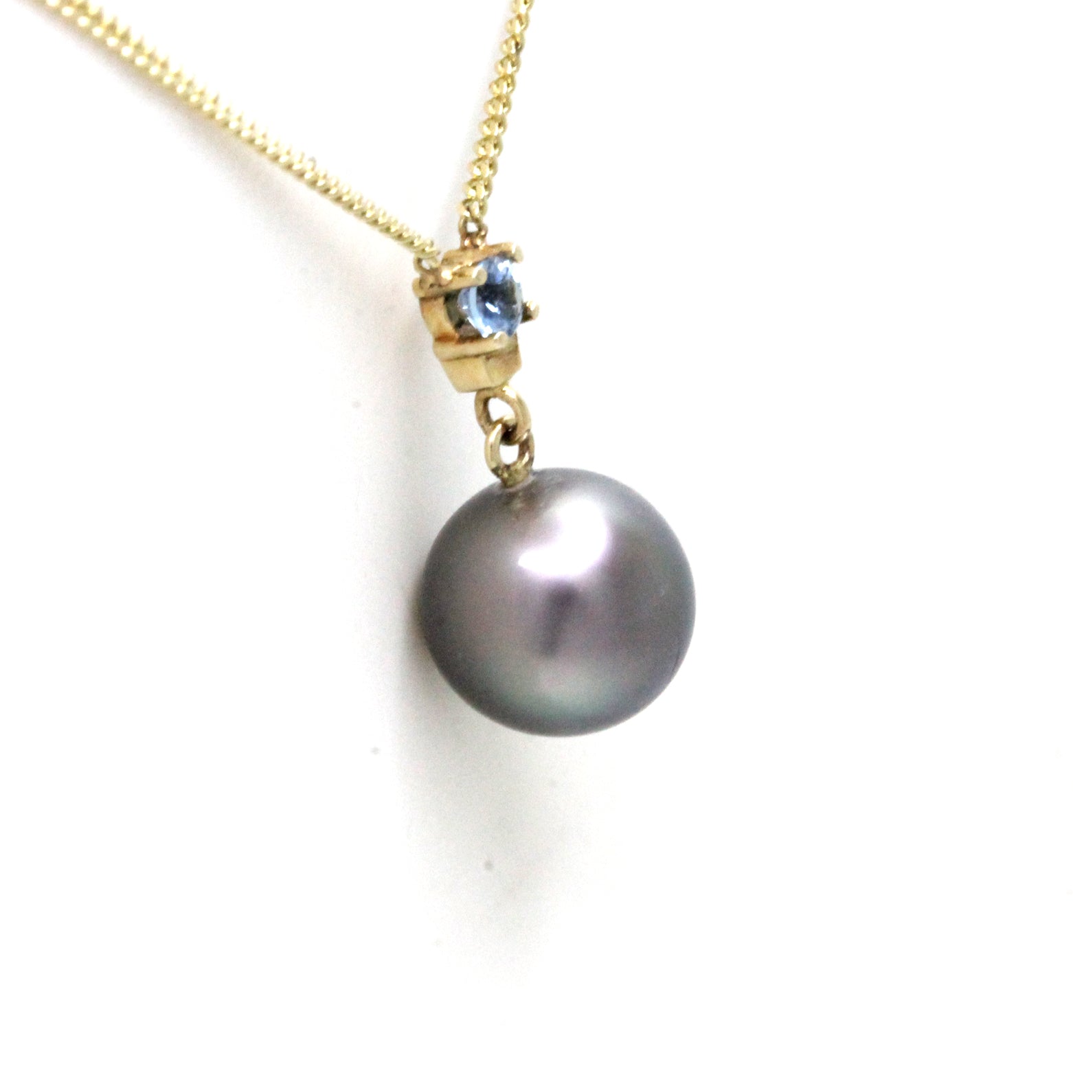 Impressive Dark Pearl on 14K Yellow Gold Pendant with Aquamarine