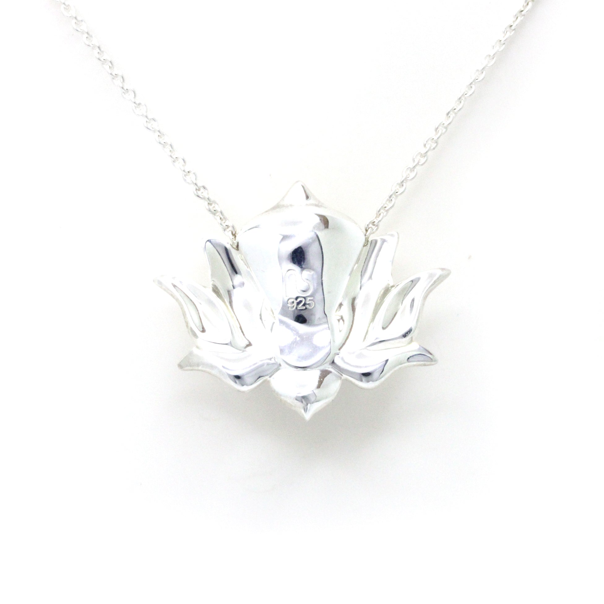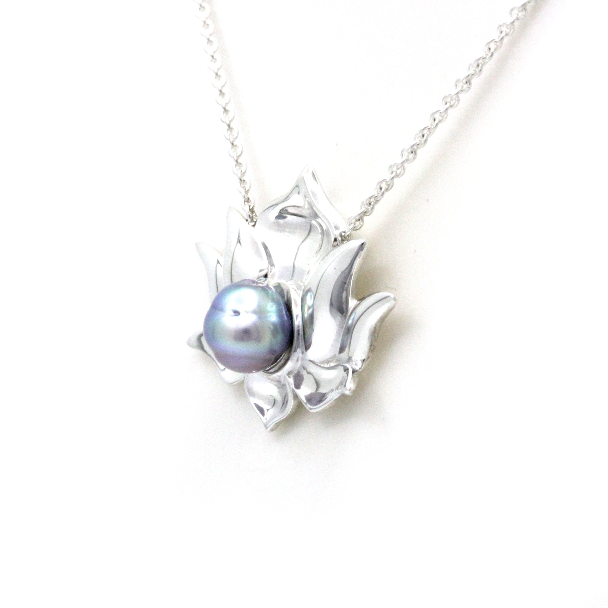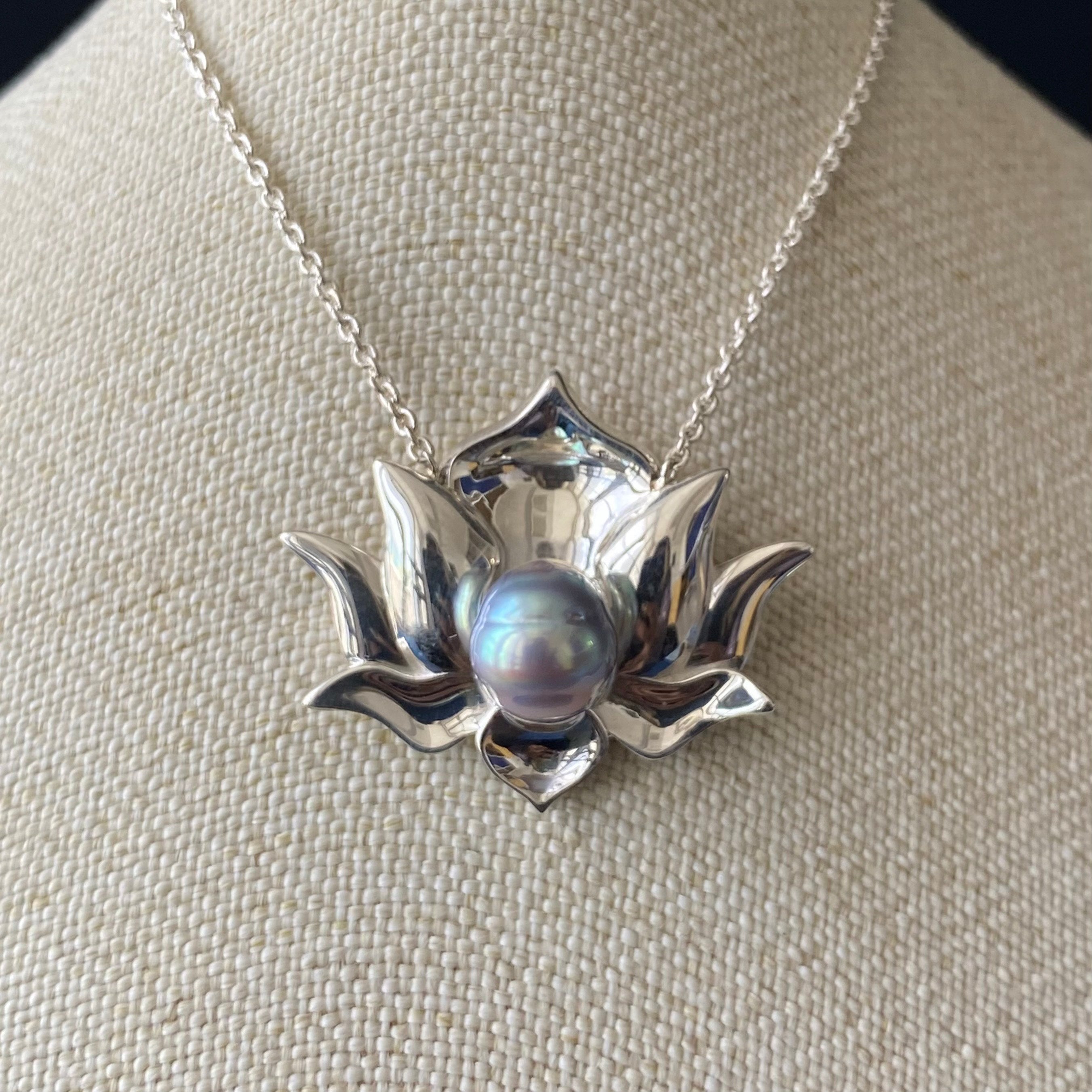 "Flor de Loto", un hermoso collar de estilo moderno y contemporáneo se añade a nuestro catálogo, y fue trabajado en plata 0.925 por la diseñadora mexicana "NS". Para darle vida a la pieza, se le colocó una Perla del Mar de Cortez única.